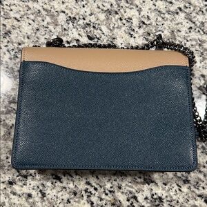 Elegant Coach crossbody with a tan flap and lavender body. Features a chic chain strap.