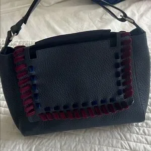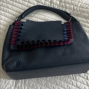 Orciani navy blue with burgundy and blue velvet accents. This bag is brand new from the Orciani boutique in Rome, Italy. Perfect for any occasion.