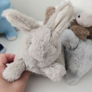 Adorable stack of plush animals in soft gray and brown tones. Perfect for cuddling and decor. Makes rattle noise.