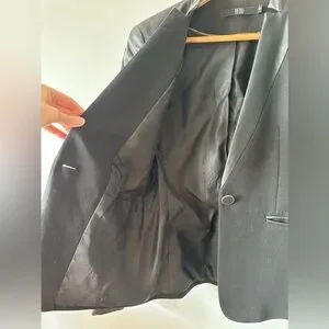 This is from Bedo, beautiful black blazer with vegan leather sleeves, this blazer is fitted and slimming