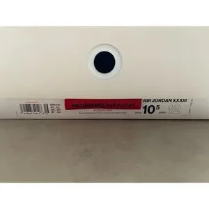 The item is a pair of Air Jordan XXXIII sneakers, size 10.5, in new condition with the original box . The sneakers feature a black upper with a unique strap design and a translucent outsole. The shoes are constructed with a combination of synthetic and textile materials. The box is in good condition with minimal wear. The sneakers appear to be free of any visible imperfections. Still icy.