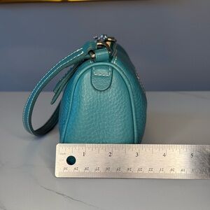 AUTHENTIC Dooney & Bourke Dillen Mini Barrel Bag in RARE Turquoise Pebbled Leather with Gold Hardware colorway. Strap can be adjusted to wear as a top-handle/shoulder bag or wristlet