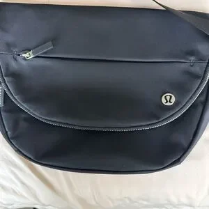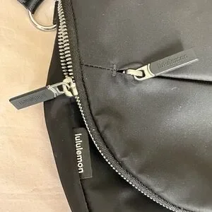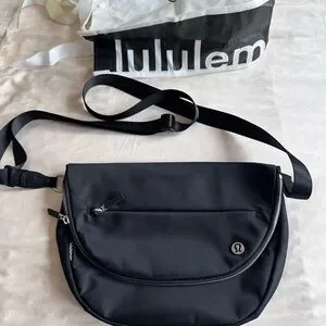 Sleek black crossbody bag with silver hardware and silver zip closure. Features Lululemon logo on tags