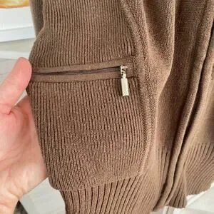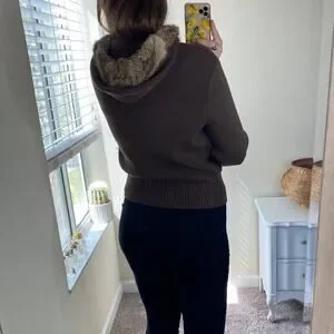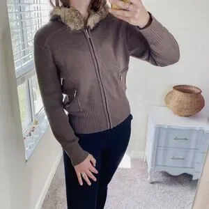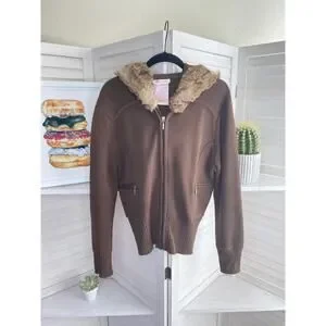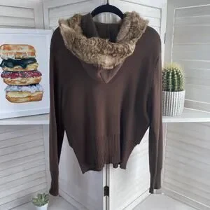 Nine & Co brown full zip sweater jacket with rabbit fur hood size large