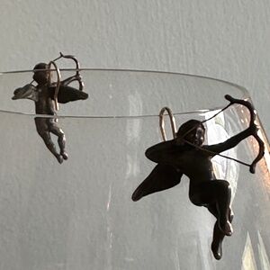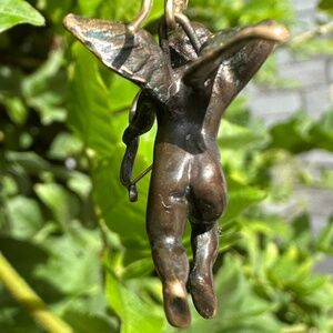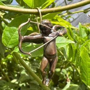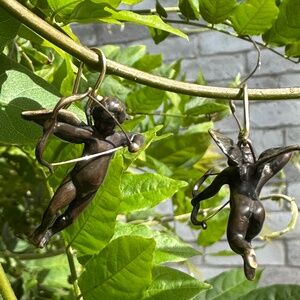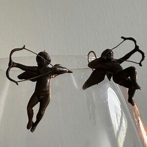 These lovely flying archers can either be angels or cupids. Both have their bows drawn, ready to shoot their respective arrows. Arrows of love? Arrows of life everlasting? Only you know. One has wings up, the other wings down. They are created from bronze and are beautifully patinated. The ear wires are 14K gold so they are hypoallergenic. They measure approximately 1 1/8" x 1" when hanging, and measure 1 1/2" from the top of the ear wire to the bottom of the earring. Each earring weighs approximately 5.5 grams.