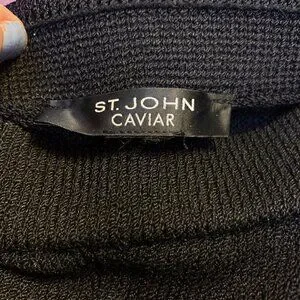 These St. John Caviar pants offer a sophisticated look with their sleek black knit fabric. The wide-leg design provides both comfort and style, making them suitable for a professional setting.