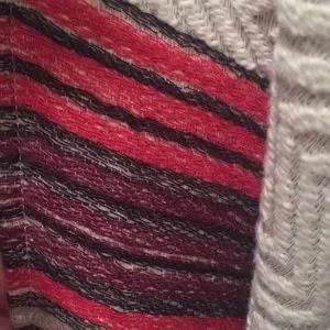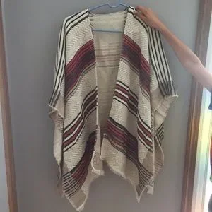 Stylish poncho with bold stripes. Features red, black, and cream colors. Perfect for layering.