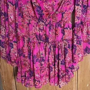Misa Los Angeles floral chiffon mini dress with bat sleeve and ruffled trim. Gold metallic threading throughout with V neckline with ruffled collar and tie straps. skirt overlay and elastic waistband. NEW without tags