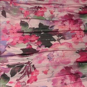 Charming dress with pink floral design. Features subtle silver accents. Ideal for stylish outings.