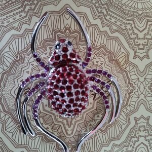 Add a touch of sparkle to your reptile habitat with this stunning silver and red rhinestone spider brooch. Perfect for creating a unique and eye-catching spooktacular look.