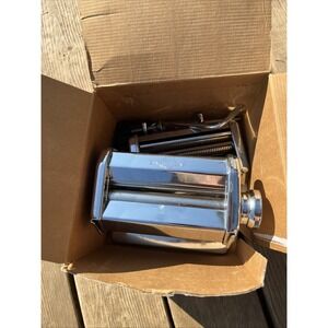 The Vintage Marcato Atlas Model 150 Pasta Machine is a high-quality automatic pasta maker and extruder made in Italy. With a sleek silver color, this machine is capable of creating various pasta shapes such as tortellini, spring rolls, and fettuccine. Manufactured by the renowned brand Marcato, this pasta maker is a reliable and durable kitchen tool that offers precision and consistency in making homemade noodles. Ideal for pasta enthusiasts looking to add a touch of Italian craftsmanship to their kitchen.
