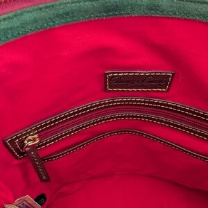 flawless Florentine leather on the outside with brushed 24k gold hardware. Tassels on each side lined with the famous Dooney green suede. The handles are accented with dark brown whipstitch detail. Feet on the bottom. Red cotton lining and key leash. Interior pockets for organizing all your goods.
