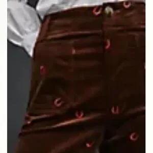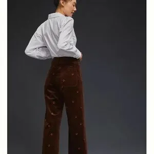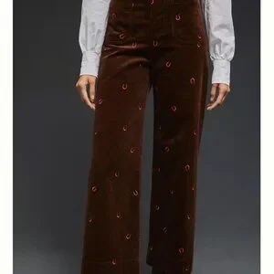 Stylish brown corduroy pants featuring coral horseshoe accents. Perfect for a chic look.