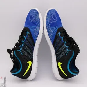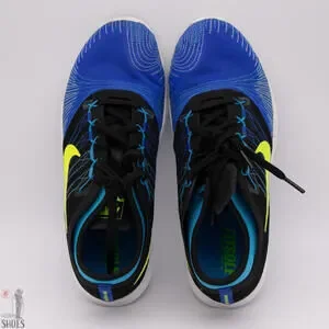 Features a breathable mesh upper in blue with black and neon yellow accents.