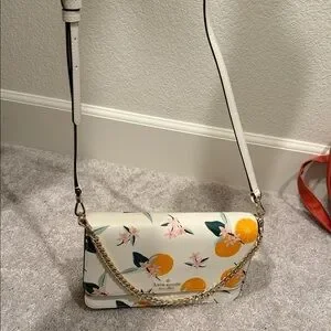 Stylish crossbody with orange and pink floral design. Gold chain strap for elegance. Perfect for any occasion.