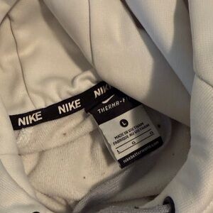 Mens Large White Nike Hoodie w/ grey camo logo. Pretty good condition. One tiny stain on front. Shown in last slide. I was examining to check and it took me a minute to notice it