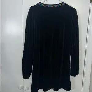 Luxurious black velvet gown with intricate embroidery. Features long sleeves and a stylish V-neckline.