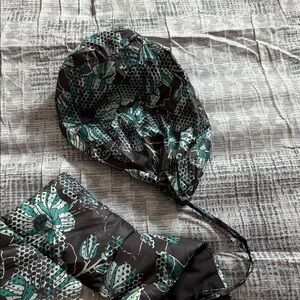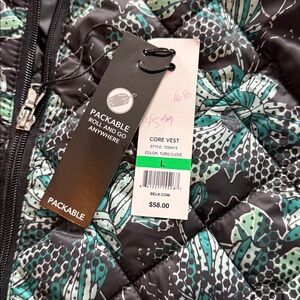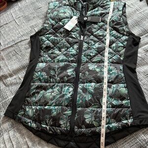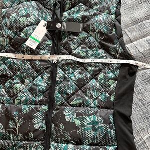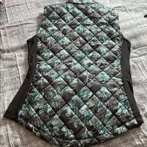 Stylish floral quilted vest with black side panels. Features a zip-up front and a chic design.