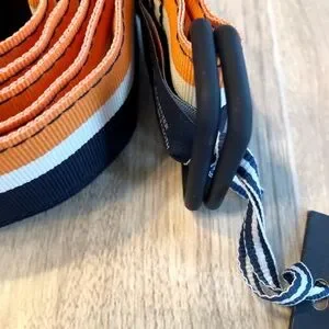 Stylish Vineyard Vines D Ring Belt. Features Bold orange and navy stripes. Perfect for casual wear.