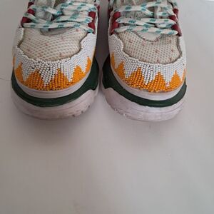 Step out in style with these vibrant women's sneakers. Featuring a mix of white, orange, and green, these shoes are perfect for adding a pop of color to any outfit. Enjoy comfort and fashion combined. There may be loose beads.