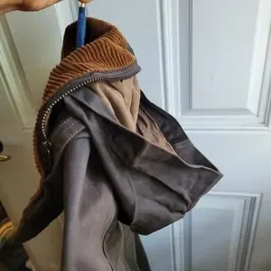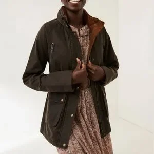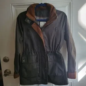 Chic like new condition utility jacket with a sleek design, beautiful accent details, zip up hood, plaid lining. Features multiple pockets and a convertible high collar with zip up hood pocket. Ideal for fall layering! Size 4