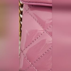 Stylish pink quilted design. Gold chain strap. Secure lock closure.