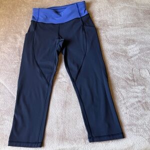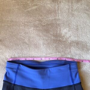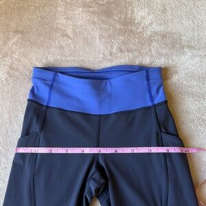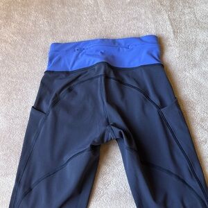 Stylish leggings with a blue waistband. Perfect for workouts or casual wear. Comfortable and flexible fit.