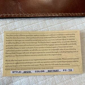 Riot Rust Patricia Nash Premium leather clutch. Style: A81218. Venezia Signature World Map print. Burned edge finish. Leather flap with magnetic closure. Deep embossed logo on back. Umber velvety faux suede interior lining. Quality construction! Zipped and lined pocket on back. 100% leather excluding lining. Includes brand certification card. Bought new, never used. Well cared for. No dust bag. Excellent condition! HL:49 Bin:B