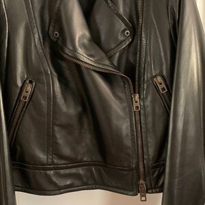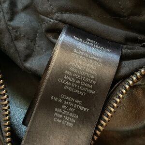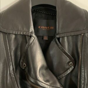 Sleek black leather jacket by Coach. Stylish design with premium finish. 100 percent lamb leather stunning timeless classic piece. Snap closure, zip closure, zip and snap closure