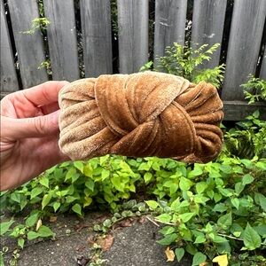 Stylish velvet headband in a rich tan color. Features a chic knotted design.