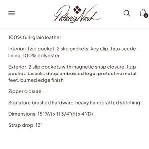 Elegant full-grain leather bag. Features zip and slip pockets. Includes key clip and tassels. Embossed logo and metal feet.