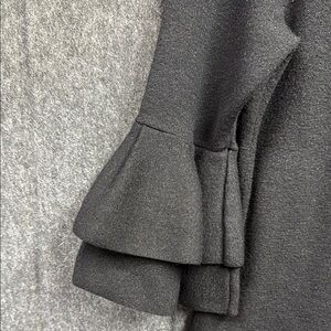 This sophisticated black sheath dress from Anthropologie is perfect for work or cocktail events. It features elegant 3/4 length bell sleeves with ruffled details and a chic bateau neckline, offering a polished and stylish appearance.