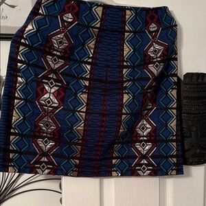 Stylish mini skirt with bold geometric patterns. Features a vibrant blue and red design. Perfect for a chic look.