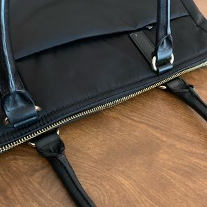 Sleek black laptop bag. Features adjustable shoulder strap. Durable and stylish design.