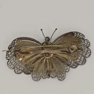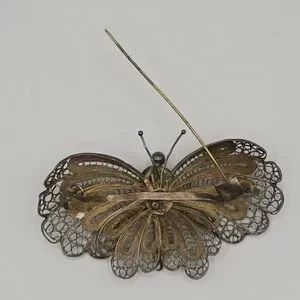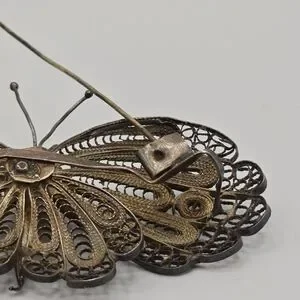 Vintage silver butterfly brooch featuring intricate openwork filigree detail. Item has been acid tested and is positive for silver; exact purity unknown but leans more towards .800.