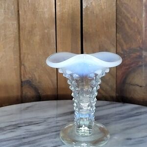 Fenton Cornocopia Horn Elf shoe Blue Opalescent Hobnail Glass Bud Vase. No chips or cracks and is in excellent original condition. $20.