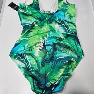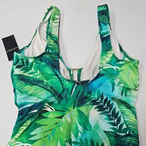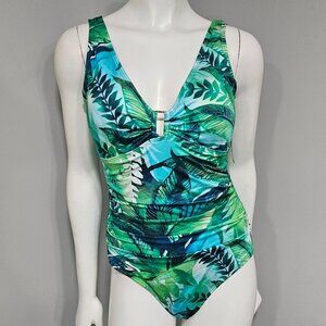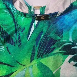 Perfect palms lend a summery vibe to this super sleek swimsuit by Lauren Ralph Lauren, a ruched front lends confidence and a ring detail adds an extra touch of chic.
