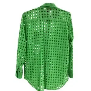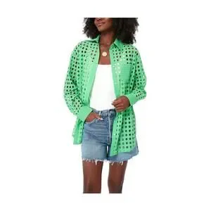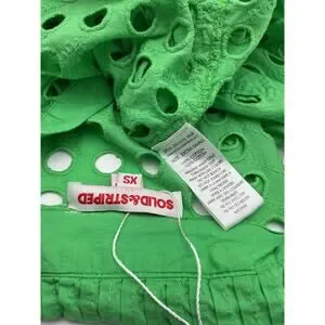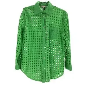 Solid & Striped 'The Parakeet' Green Cotton Oxford Tunic Shirt Size XS: spread collar, long sleeves, button closure on cuffs, hanger loop on back, functioning patch pocket, all over eyelet details, measurements: 20 inch bust x 29 inch length.