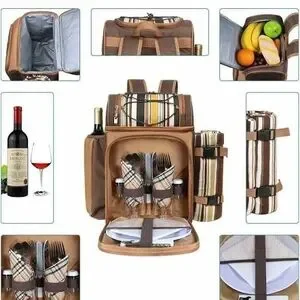 Enjoy your outdoor gatherings with this elegant picnic set featuring stylish brown and tan accents. Perfect for any occasion, this set combines functionality with a touch of class.Picnic backpack cooler set with blanket