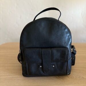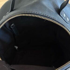 Excellent used condition. Black leather mini backpack. One interior zip pocket and one interior slip pocket. Front pocket with flap and magnetic closure. Silver coloured hardware. Adjustiable backpack staps and top handle.
