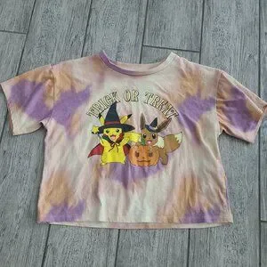 This festive Pokémon T-shirt is perfect for Halloween fun! Featuring Pikachu and Eevee dressed in witch hats with a pumpkin under the text "Trick or Treat," it has a purple and orange tie-dye background for a spooky seasonal look. A must-have for any Pokémon fan’s fall wardrobe.