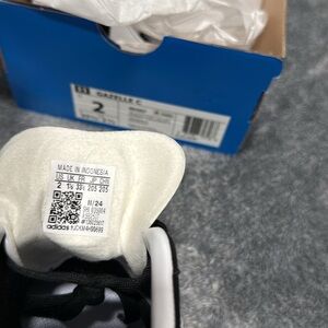 Iconic Adidas Gazelle with bold black and white contrast. Features signature three-stripe design.