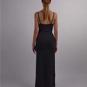 Sleek black maxi dress with a side slit. Perfect for any occasion. Sustainably made.