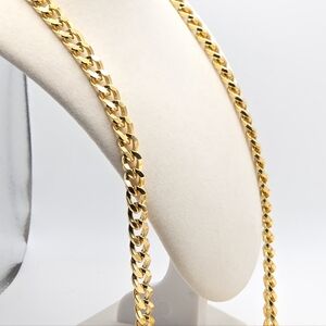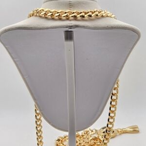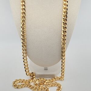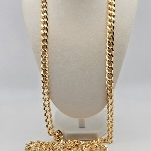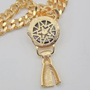 This luxurious piece of costume jewelry features a rich, bright gold-tone finish and a stylish, substantial cuban/curb link chain. The main focus is the striking pendant which has a