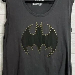 Dark grey sleeveless tee shirt with Batman logo and gold dots. Size L In good condition. P2P 19” L 26” See pictures for details and normal wear and tear.