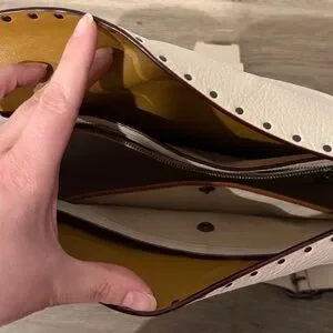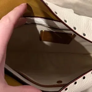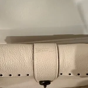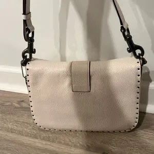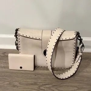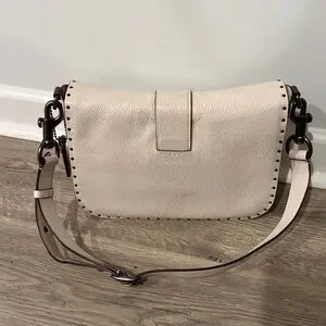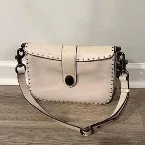 Stylish chalk colored pebbled leather crossbody bag with studded details. Features a secure clasp and adjustable strap.