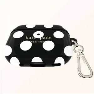 Stylish Kate Spade case with black and white polka dots. Compatible with AirPods Pro. Includes keychain attachment.