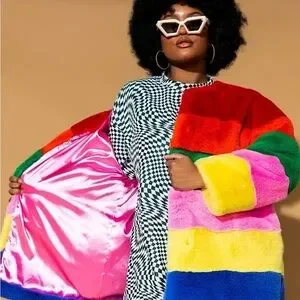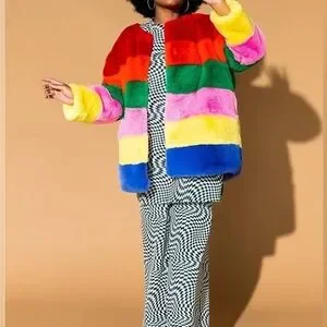 Brighten up your wardrobe with this vibrant faux fur jacket. Featuring a stunning array of colors, this jacket is perfect for making a bold fashion statement. Stay warm and stylish with this eye-catching piece.