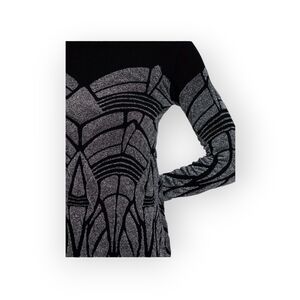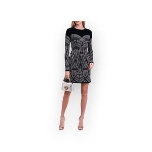 Chic long sleeve dress with intricate silver patterns. Perfect for evening wear.