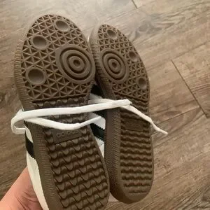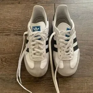 Stylish Adidas sneakers in white with black stripes. Perfect for casual wear.